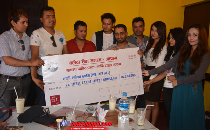 भूकम्प प्रभावितको सहगोर्थ राहत सामग्री एवं अस्थायी घर निर्माण अभियानमा जुटिरहेको युवा फिल्मकर्मी संगठित ‘हामी सबैका लागि’ लाई जापानको एक संस्थाले आर्थिक सहयोग गरेको छ । अनामनगरमा मंगलबार आयोजित एक भेलामा जापानको बलेवा सेवा समाजले ‘हामी सबै लागि’ मा आवद्ध प्रतिनिधिलाई ३ लाख ५० हजारको चेक हस्तान्तरण गर्यो ।