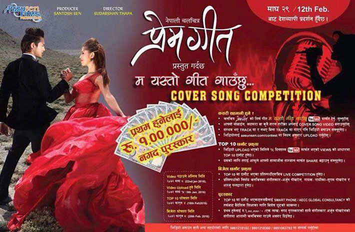 प्रेम गीतको उत्कृष्ट्र टाइटल ट्रयाक गाउनेलाई निर्माण पक्षले एक लाख रकम पुरस्कार स्वरुप दिने घोषणा गरेको छ । त्यसैले पनि युवा पुस्ताको आकर्षण ‘प्रेम गीत’ प्रति देखिएको हो । कतिपय कलेज तथा विद्यालयले त स्वयम् ‘म यस्तो गीत गाउँछु’ भन्ने अभियान चलाइरहेका छन् भने फिल्म निर्माण युनिटले पनि ‘कलेज क्याम्पियन’ लाई पहिलो प्राथमिकतामा राखेको छ । ‘म यस्तो गीत गाउँछु’ गाउनेको संख्या दिन प्रतिदिन बढ्दै गइरहेको निर्देशक थापा बताउँछन् । आशुसेन फिल्मस्को प्रस्तुतीमा सन्तोष सेनले निर्माण गरेको फिल्म ‘प्रेम गीत’ युवा पुस्ताको प्रेममा आधारित छ । जसको शिर्ष भूमिकामा नायिका पूजा शर्मा र नायक प्रदीप खड्का प्रस्तुत भएका छन् । मुस्ताङ र काठमाण्डूका सुन्दर दृश्यमा छायाँकन गरिएको फिल्मको पहिलो टिजर तथा शिर्ष गीतको भिडियालाई दर्शकले अत्याधिक रुचाएका छन् । सुदर्शन स्वयमले पनि ‘मेरो एउटा साथी छ’ पछि दर्शकले गहिरो प्रेमको महसुश गर्ने फिल्म ‘प्रेम गीत’ पाउने बताउँदै आएका छन् । ‘म यस्तो गीत गाउँछु’ अभियनमा सरिक हुंन तपाईलाई तलको भिडियोमा सहयोग गर्न सक्छ, हेर्नुस् :