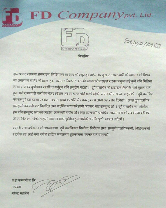 ‘राम प्यारी’ र ‘नाईं नभन्नू ल ४’ को काठमाण्डौं बाहिरको सार्वजनिक व्यापारिक हिसाब गलत रहेको वितरण कम्पनी एफडिले जनाएको छ । विज्ञप्ती निकाल्दै उक्त कम्पनीले दुई फिल्मको सार्वजनिक व्यापारिक डाटामा कुनै सत्यता नरहेको उल्लेख गरेको छ । केही अनलाइन मिडियाले आफ्नै तवरले दुई फिल्मको व्यापारिक रिपोर्ट सार्वजनिक गरेका थिए । आफैंले वितरण गरेका फिल्मको व्यापारिक रिपोर्ट फरक हुन आएपछि एफडि यस प्रकारको विज्ञप्ती निकाल्न बाध्य भएको हो ।